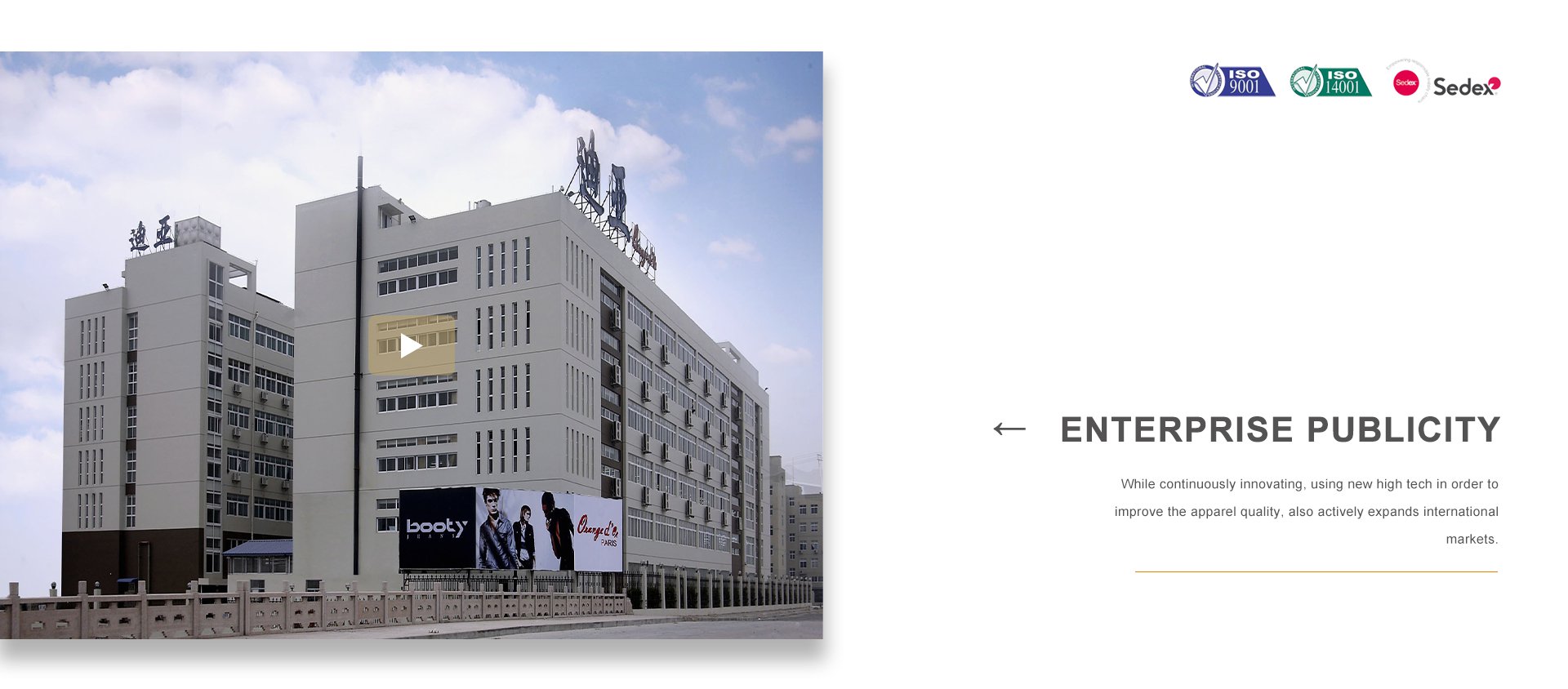 浙江迪亞服飾有限公司于1998年在世界時(shí)尚品牌之都——法國(guó)巴黎二區(qū)應(yīng)運(yùn)而生。同年,在浙江省甌海經(jīng)濟(jì)開(kāi)發(fā)區(qū)東方南路28號(hào)設(shè)立服裝制造工廠。公司集服裝設(shè)計(jì)、生產(chǎn)、營(yíng)銷、品牌于一體,在不斷創(chuàng)新、采用高新技術(shù)提高服飾質(zhì)量的同時(shí),積極拓展國(guó)際市場(chǎng),海外營(yíng)銷部長(zhǎng)期與LV集團(tuán)旗下的MAJE、SOEUR、BALIBARIS等國(guó)際著名品牌保持非常緊密的合作關(guān)系。